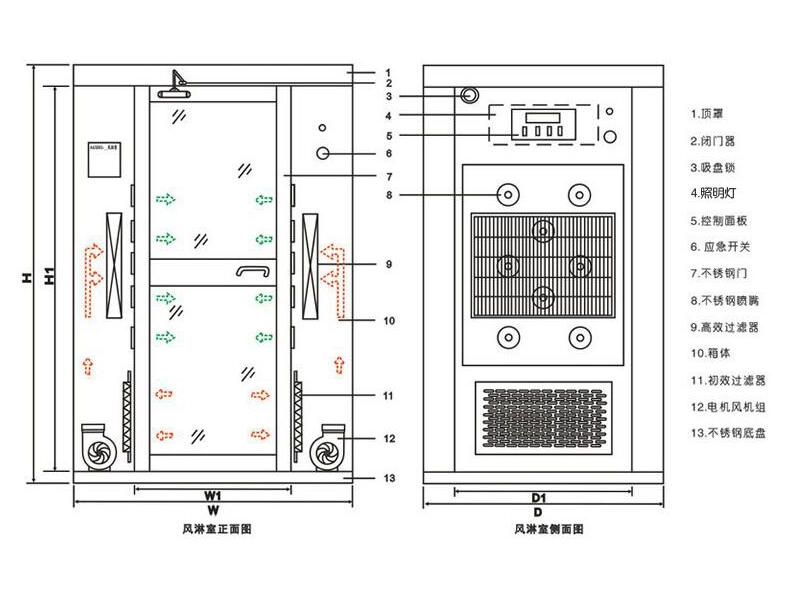 3、单向通道风淋,从非洁净区进入,关门后光电感应自动吹
